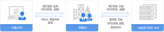 - 회원사가 서울평가정보㈜ 서버에게 이용고객의 개인정보(주민번호, 성명)을 제공하면 서울평가정보㈜ 서버는 결과값(주민번호, 성명, 결과코드)을 전송한다.