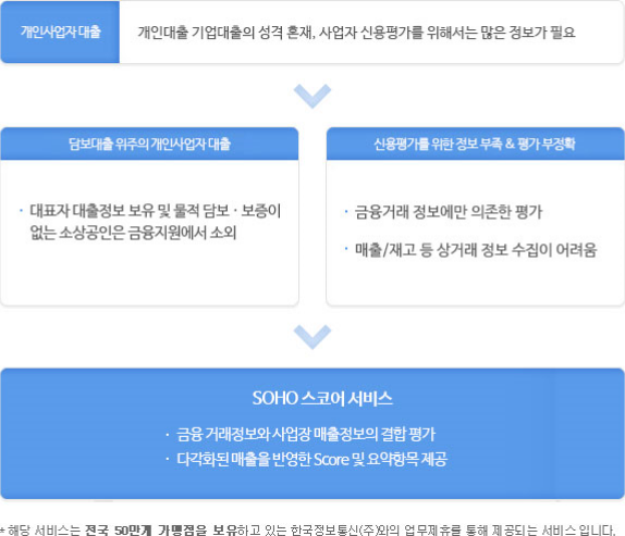 개인사업자의 사업장 매출정보를 금융 거래정보와 결합하여, 금융기관이 개인사업자에 특화된 신용평가를 고도화할 수 있도록 제공하는 신용평가 모형
