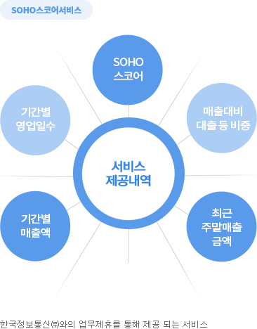 금융기관의 개인사업자 대출 심사 및 개인사업자 신용판단을 위하여 필요한 금융 거래정보와 사업장 매출정보 결합을 통하여 SOHO스코어 및 사업자 매출 등 통계정보를 제공하는 서비스입니다.